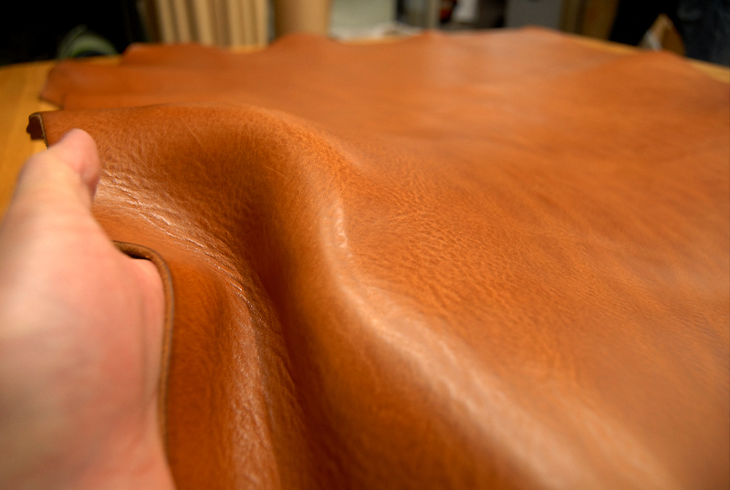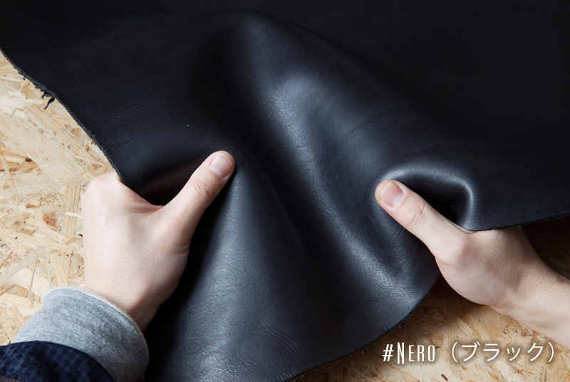 イタリア・トスカーナ地方・サンタクローチェで昔ながらのバケッタ製法で作られた染料、芯通しのフルベジタブルタンニンシュリンクレザー。