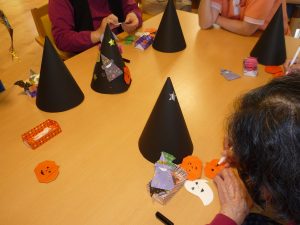 秋の旬の物を答えたり、ジェスチャーでのスポーツクイズ、ハロウィン製作、紙芝居等を行い、とても楽しい時間を過ごせました。皆さん楽しそうにされていました。