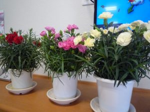 メッセージカードを女性の入居者様にお渡しし、カーネーションを飾りました。